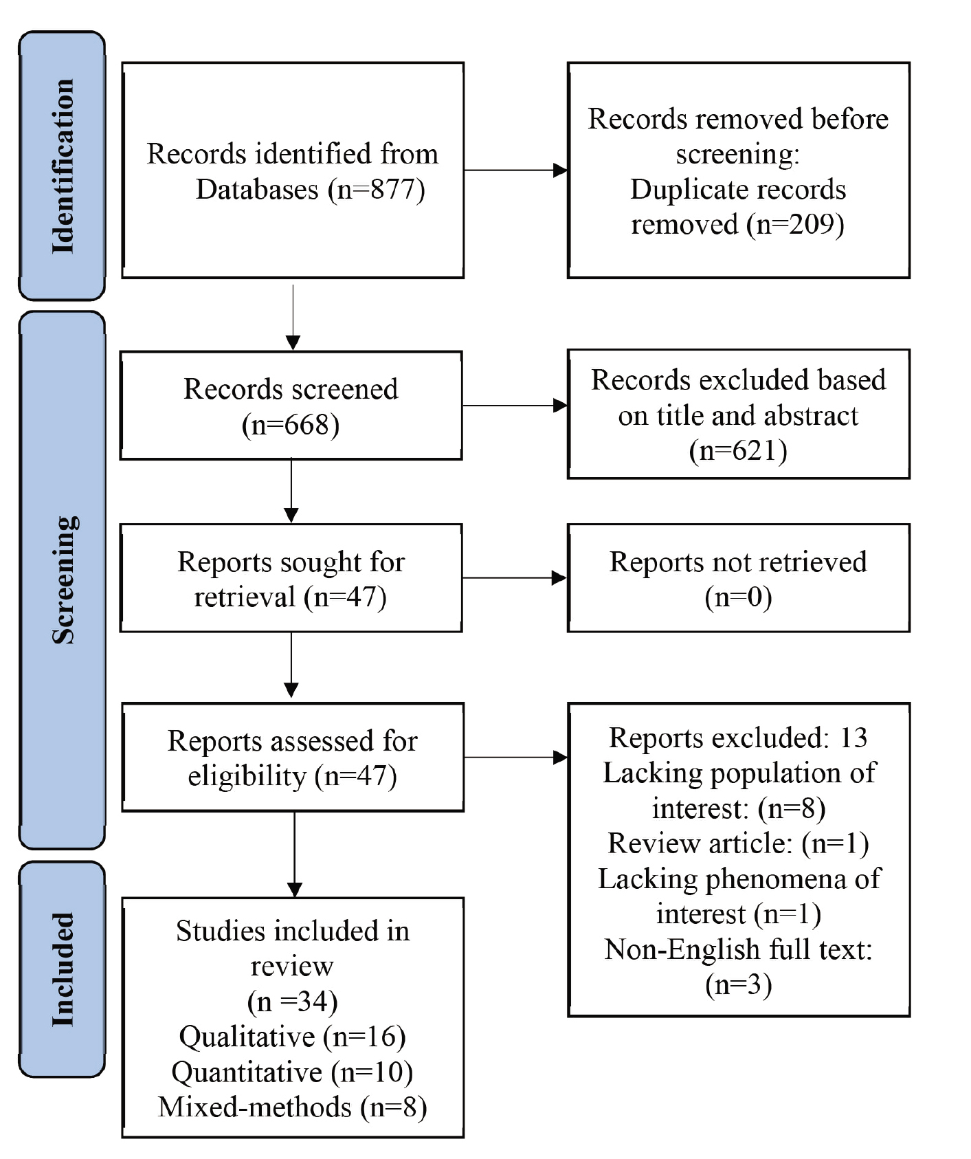 In the initial search, 877 studies were identified. After removing the duplicate studies, the titles and abstracts of 668 articles were reviewed. Of these, 621 articles were excluded, leaving 47 articles to be assessed for eligibility. After reviewing the full texts, 13 studies were excluded (in eight studies, the population was not the reproductive donors, three studies had English abstracts with non-English full texts, one was a review article, and one did not report the phenomena of interest, i.e., reproductive donors’ needs) (Figure 1).