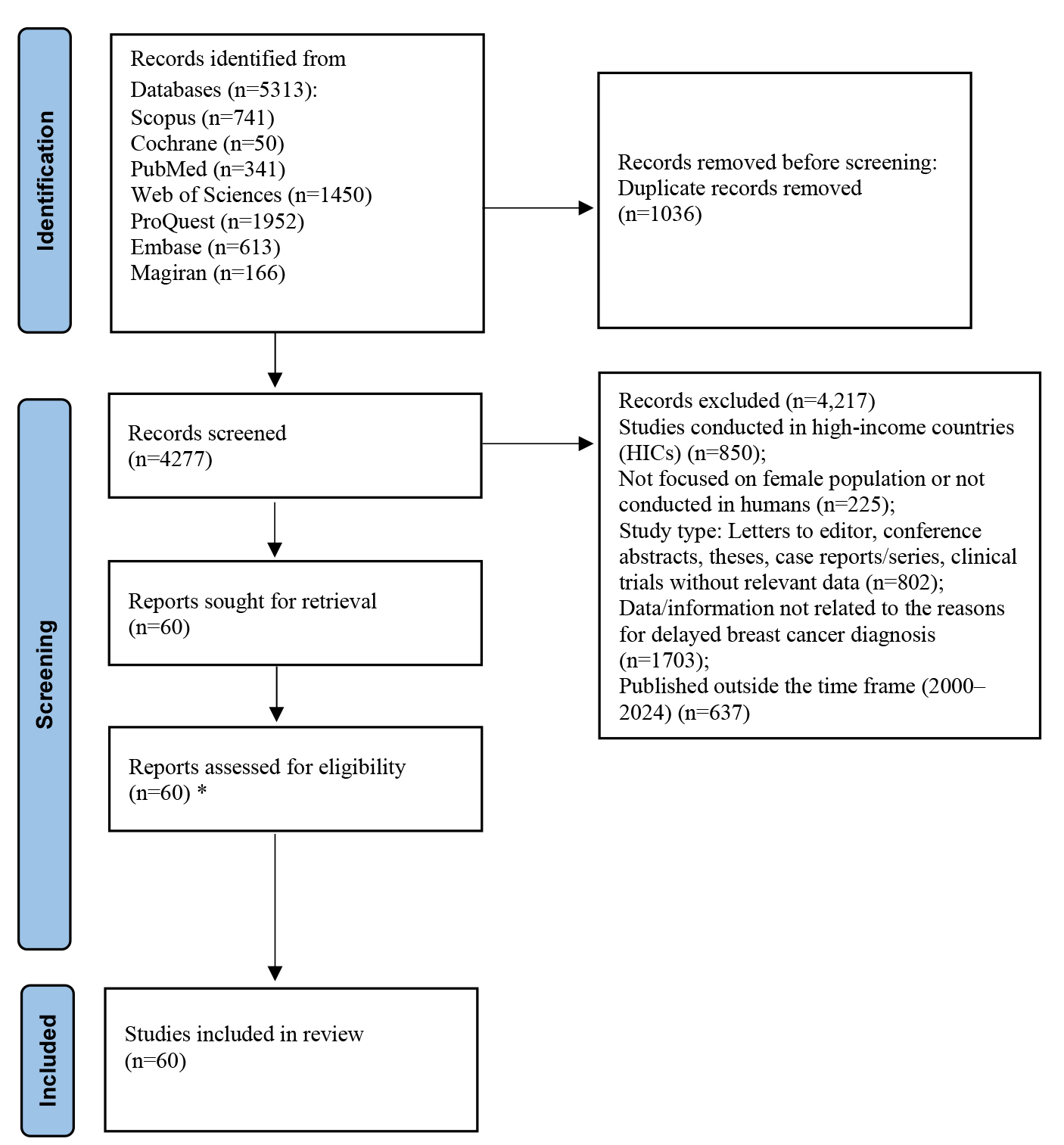 The present study is a scoping review conducted from October 2023 to September 2024 to explore the factors associated with delays in breast cancer diagnosis in LMICs. Scoping reviews are an effective method for assessing the breadth of existing literature on a specific topic and providing a comprehensive overview of the subject. 14 In this review, we utilized the five-step methodological framework proposed by Arksey and O’Malley. 15 The steps of this framework include identifying a research question, identifying relevant literature, selecting literature, charting the data, and reporting the findings. The Preferred Reporting Items for Systematic reviews and Meta-Analyses extension for Scoping Reviews (PRISMA-ScR) guideline was utilized to conduct and report this scoping review. 16